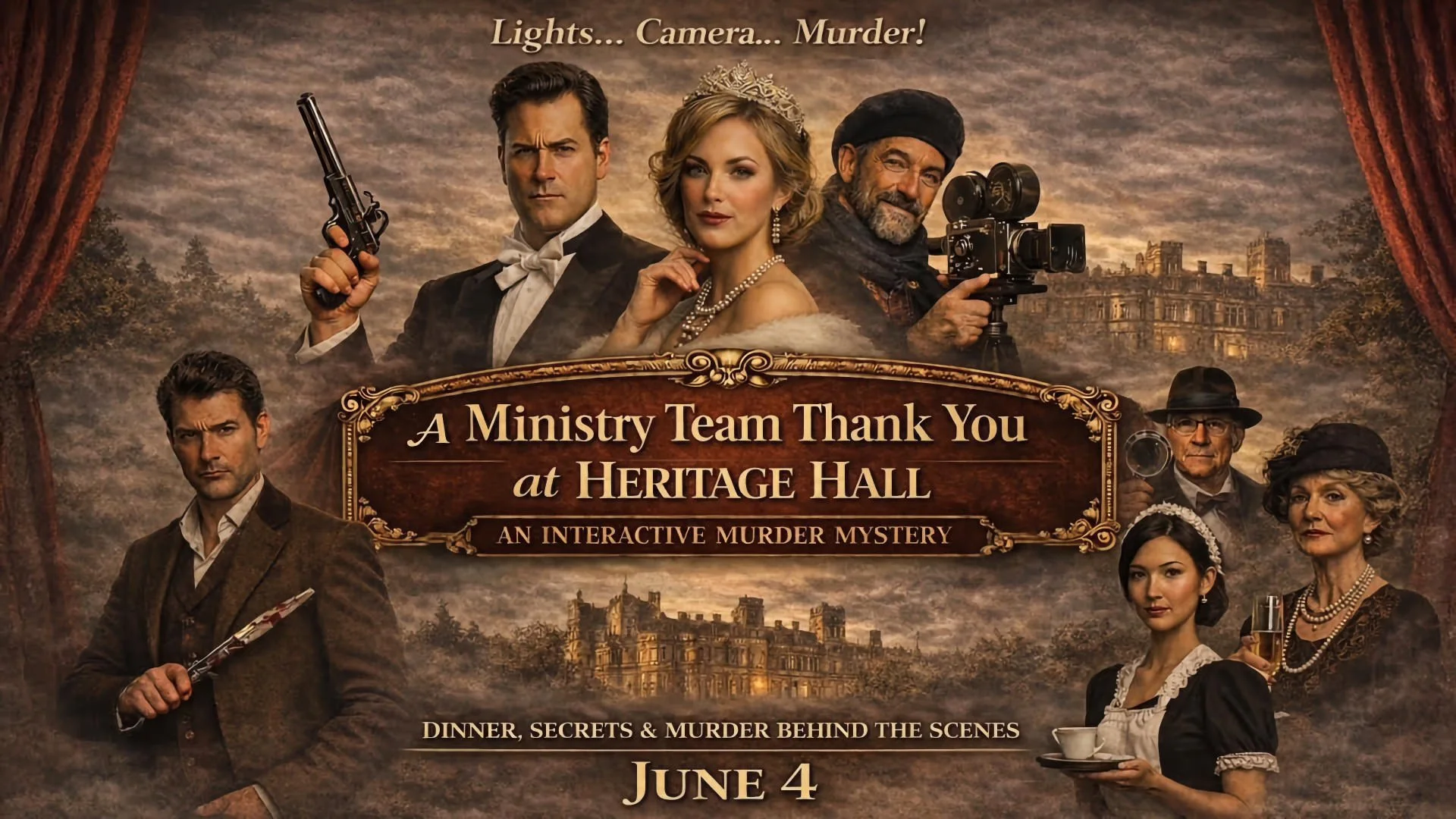 Welcome to the set of a lavish new period drama, inspired by the elegance and intrigue of an English country estate in the 1920's. The film’s eccentric director has chosen this very venue to shoot several key scenes—and you have been invited as extras and crew in the production. But you will not be required to act.